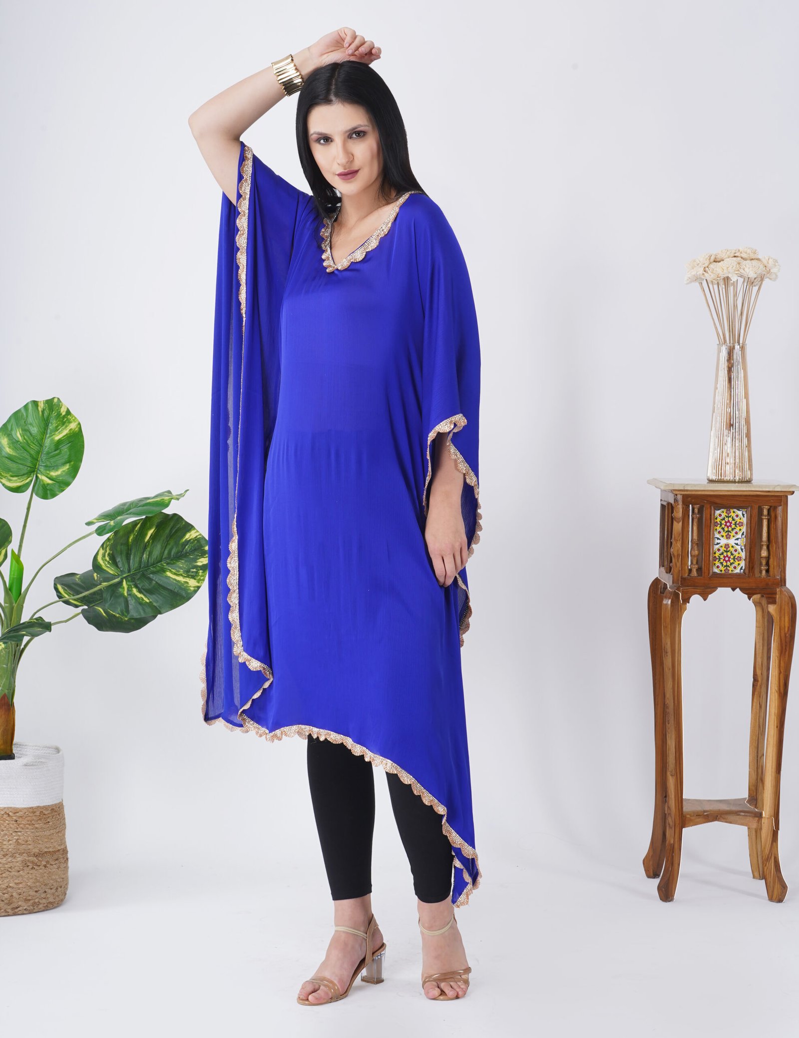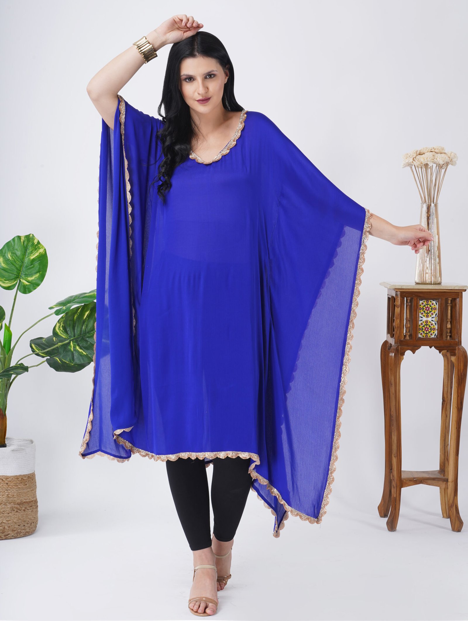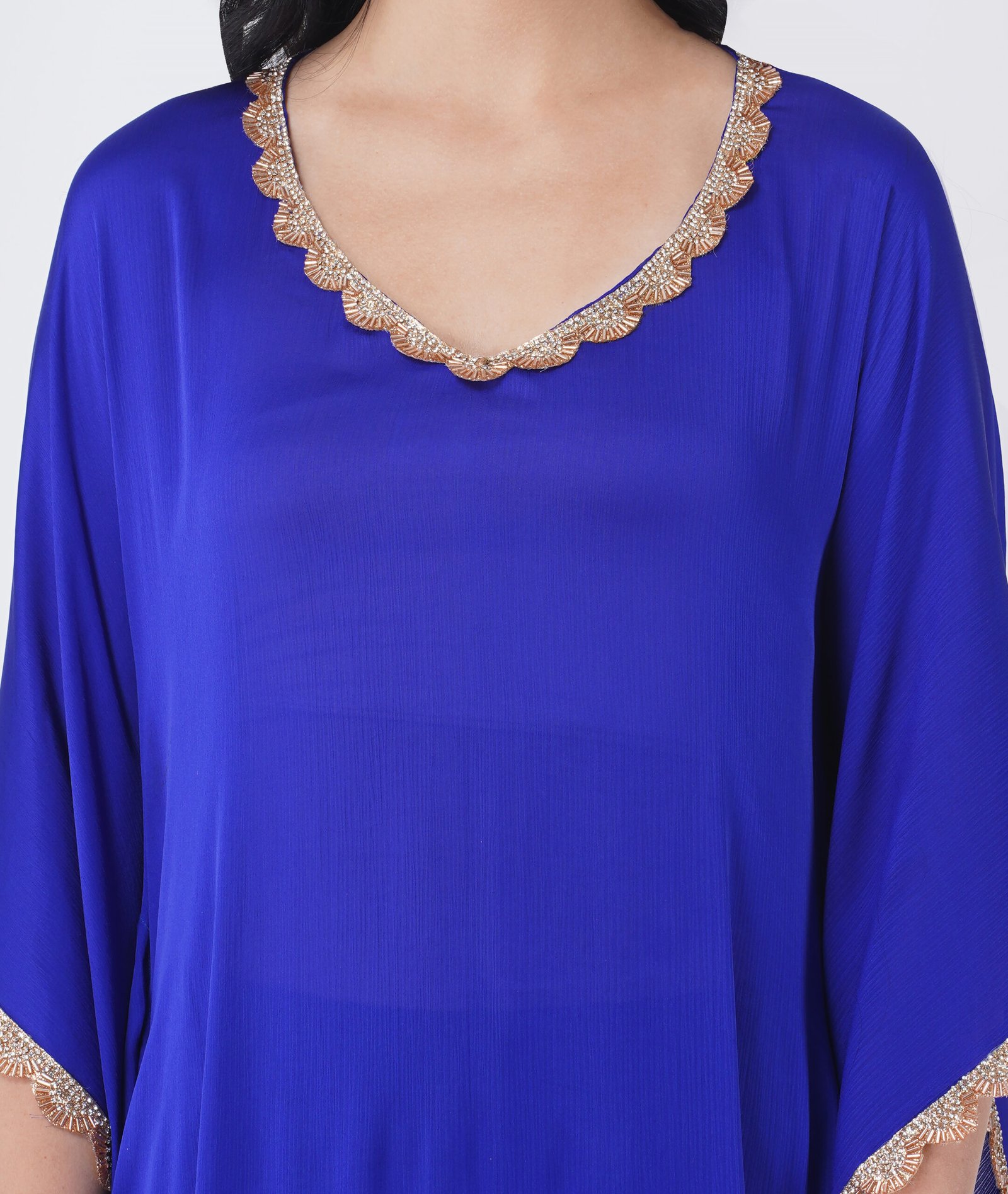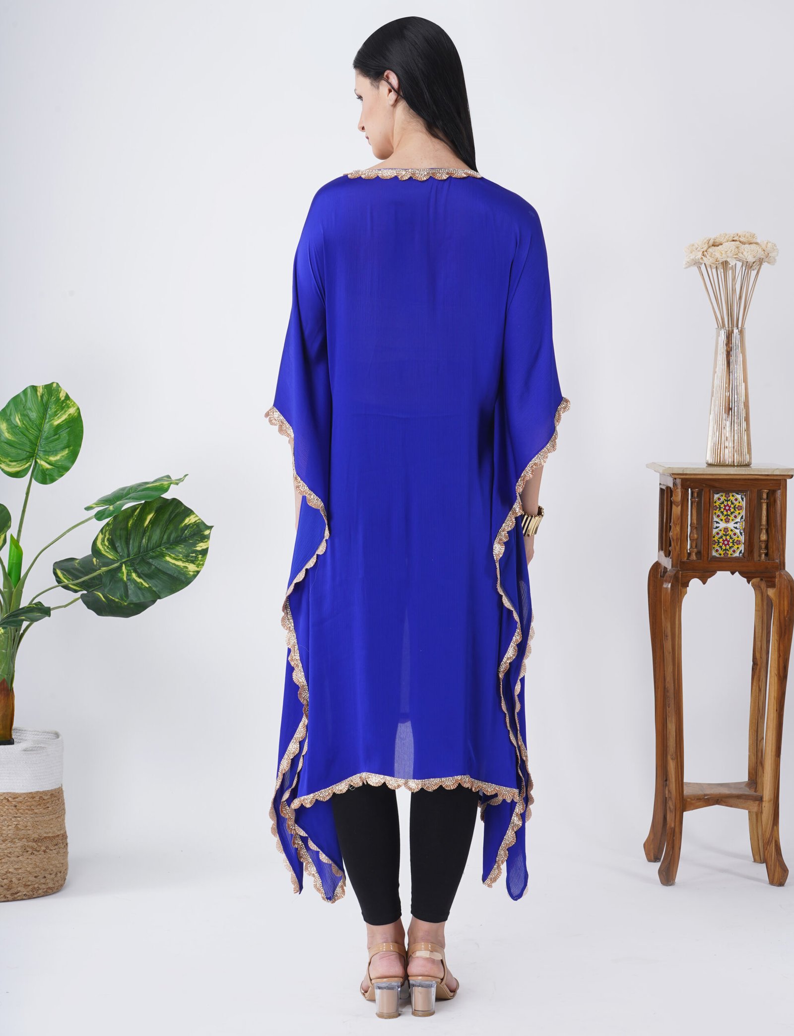 Crepe georgette flowy kaftan. Hand embroidery all around the kaftan. Perfect for all semi-formal occasions. It comes with a hand-crafted belt.