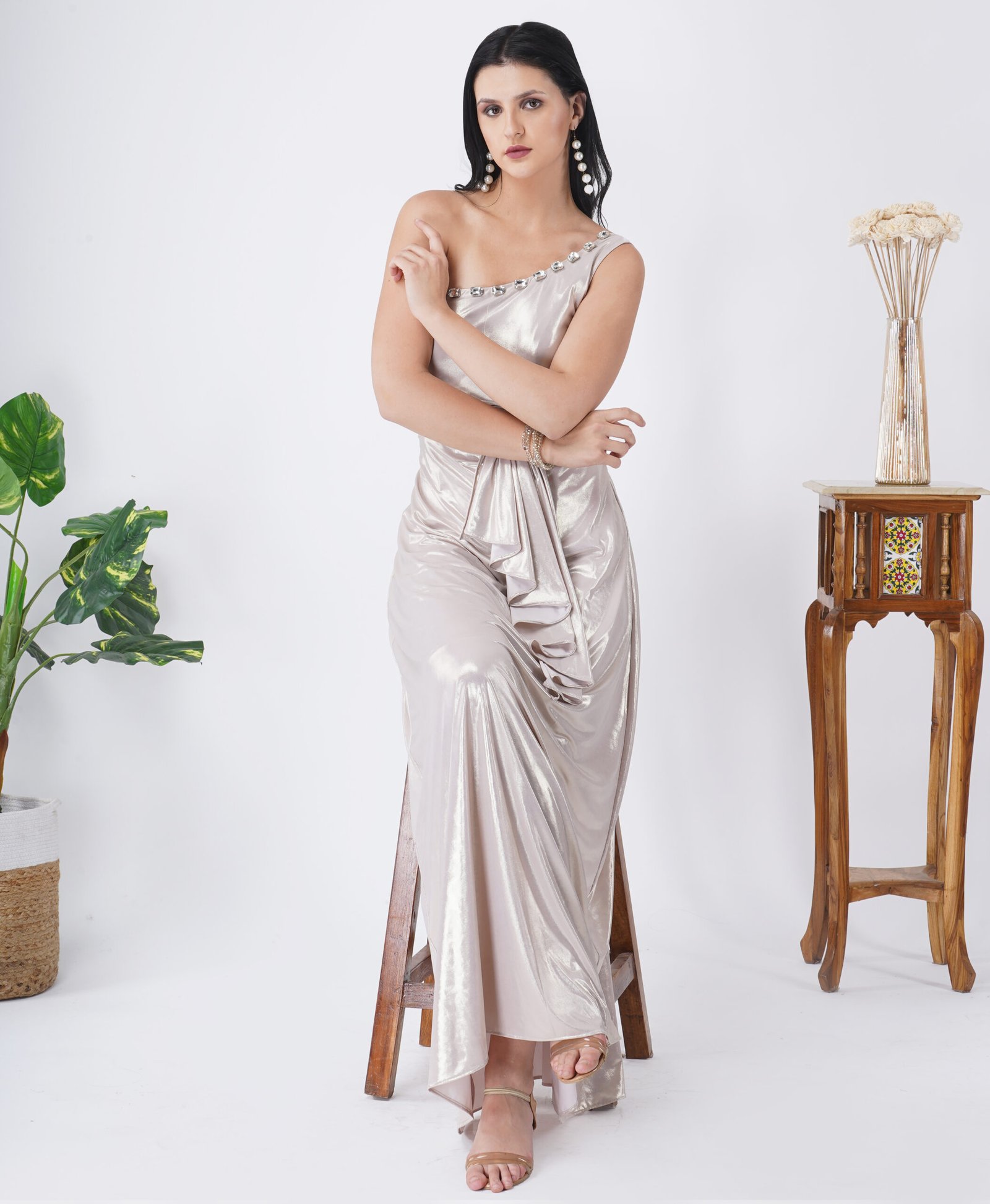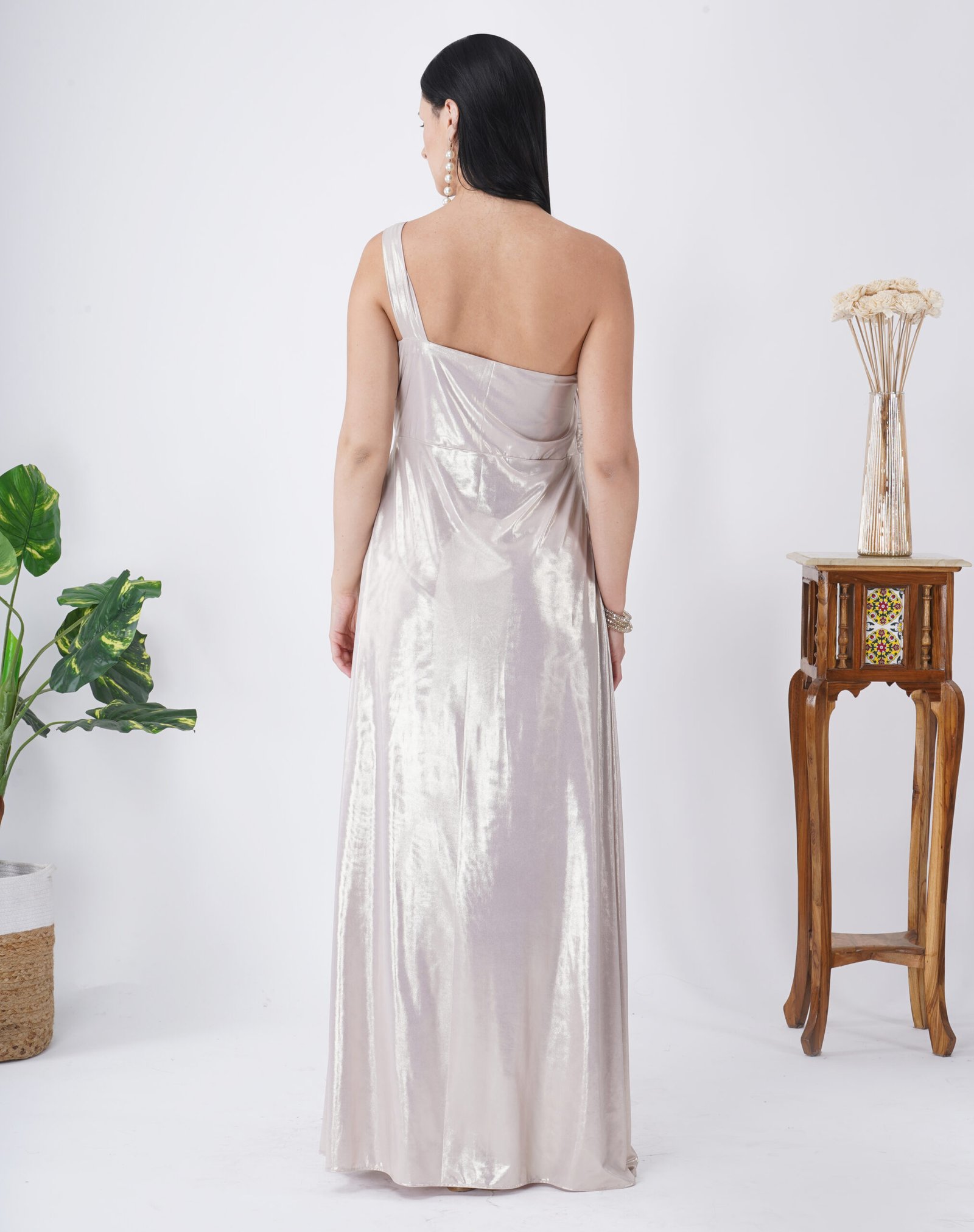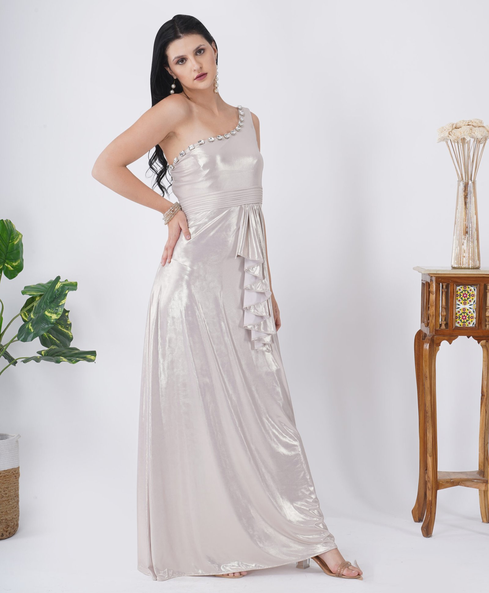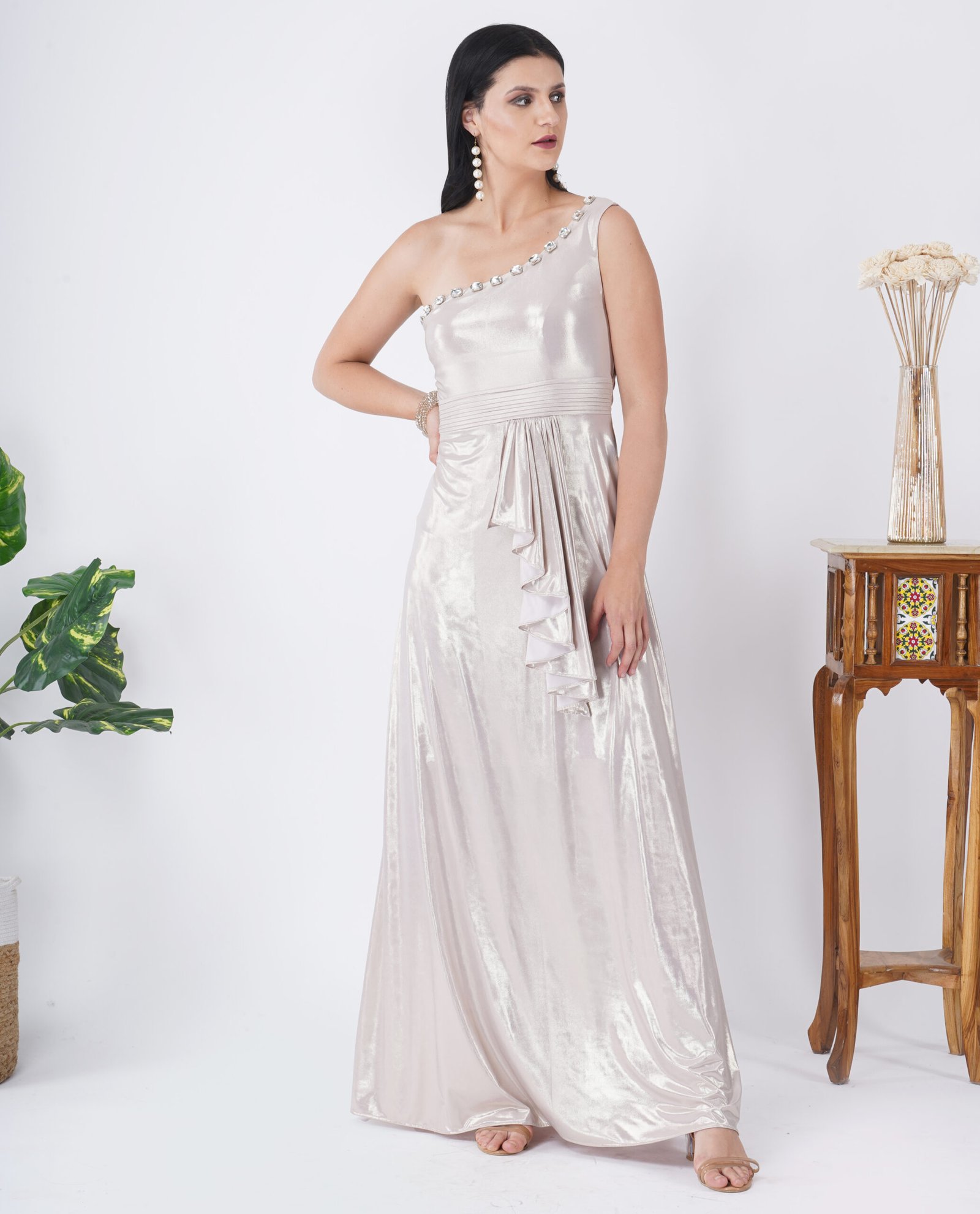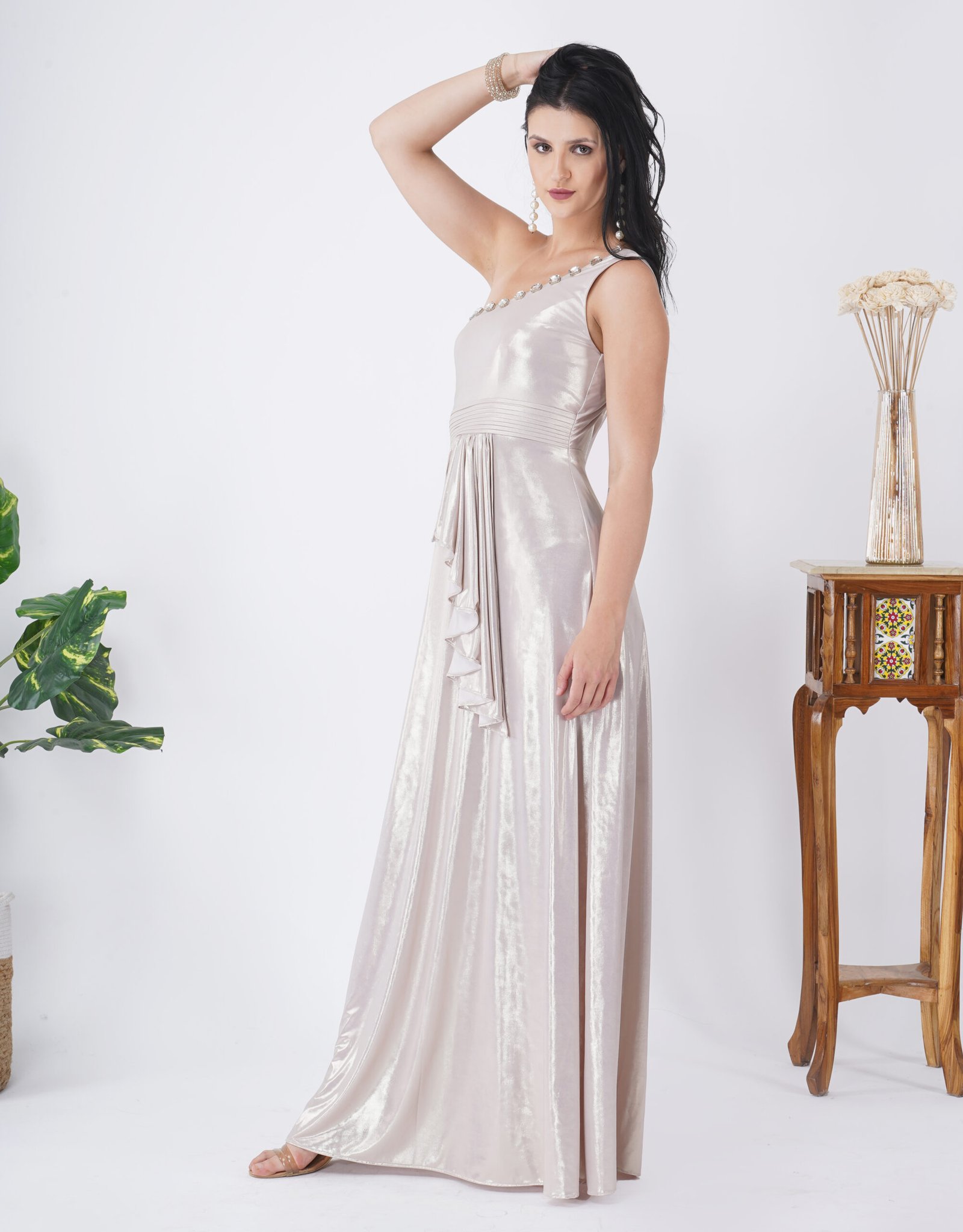 Long dress in Lycra. Fully lined. Stone work on neck with pleating on waistband. A very flattering dress which is super slimming and Flowy.