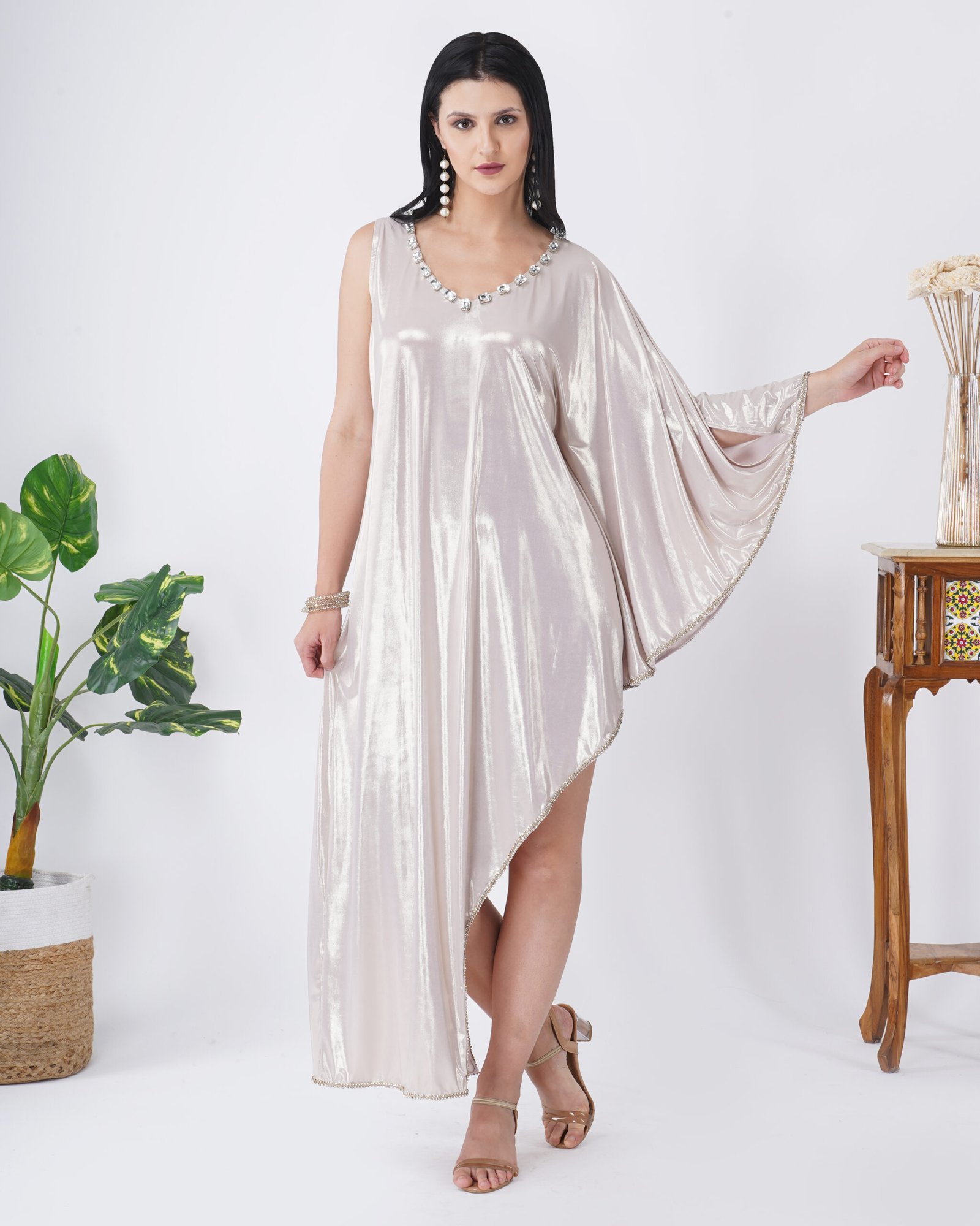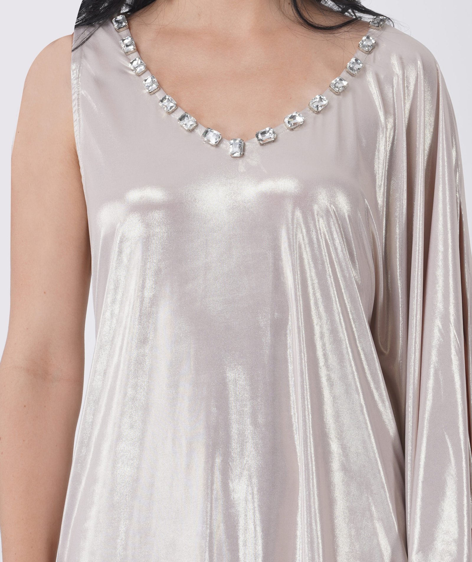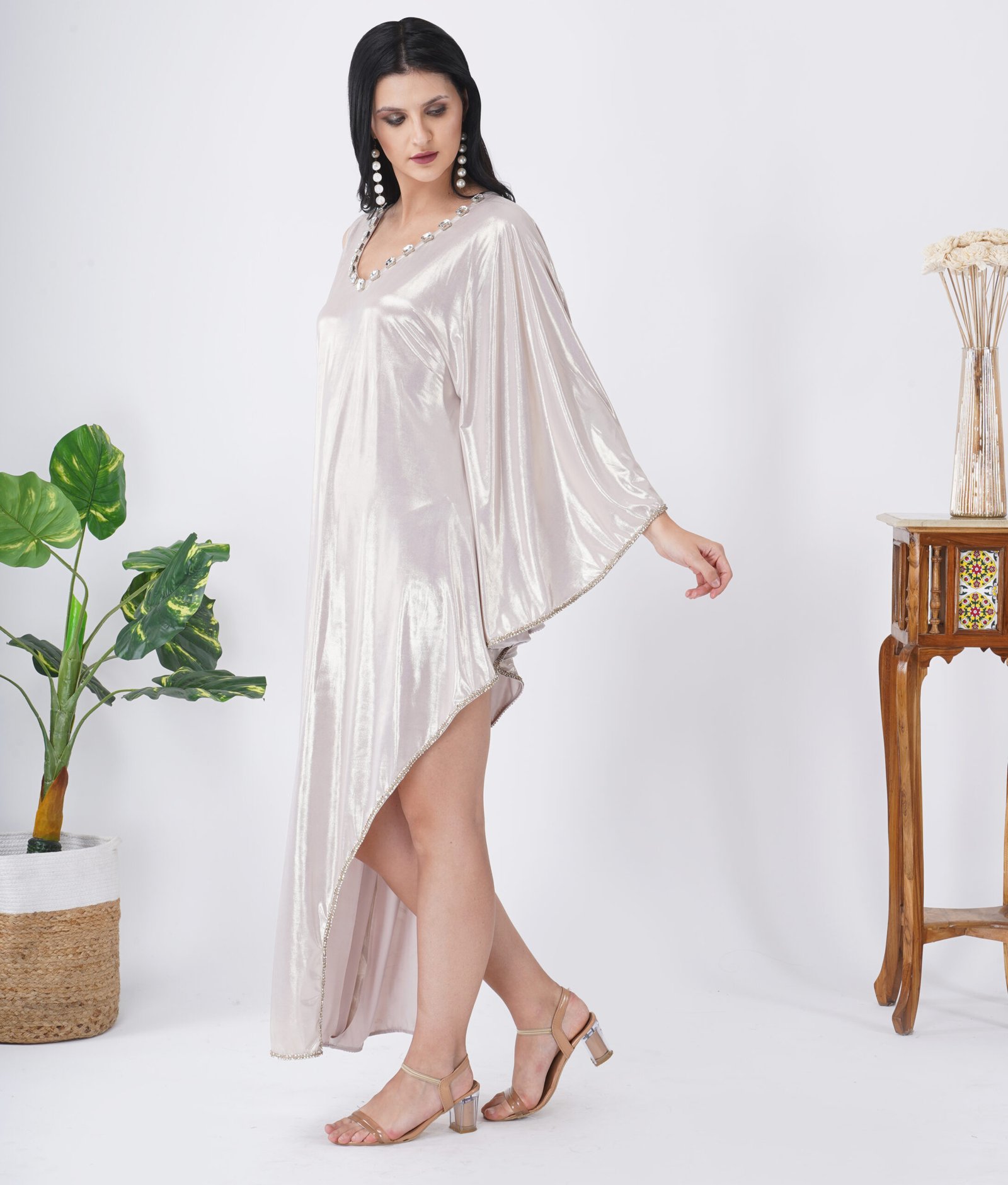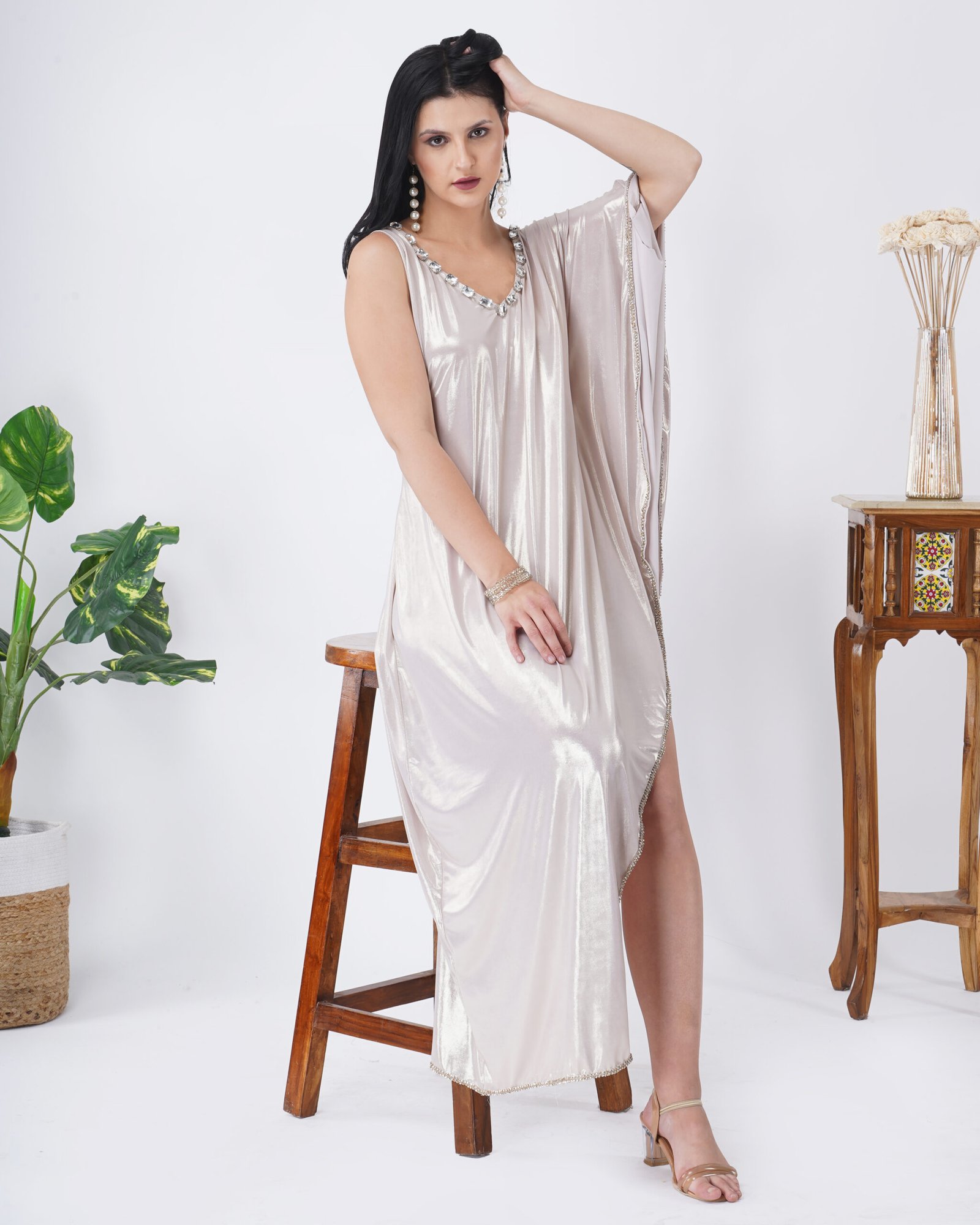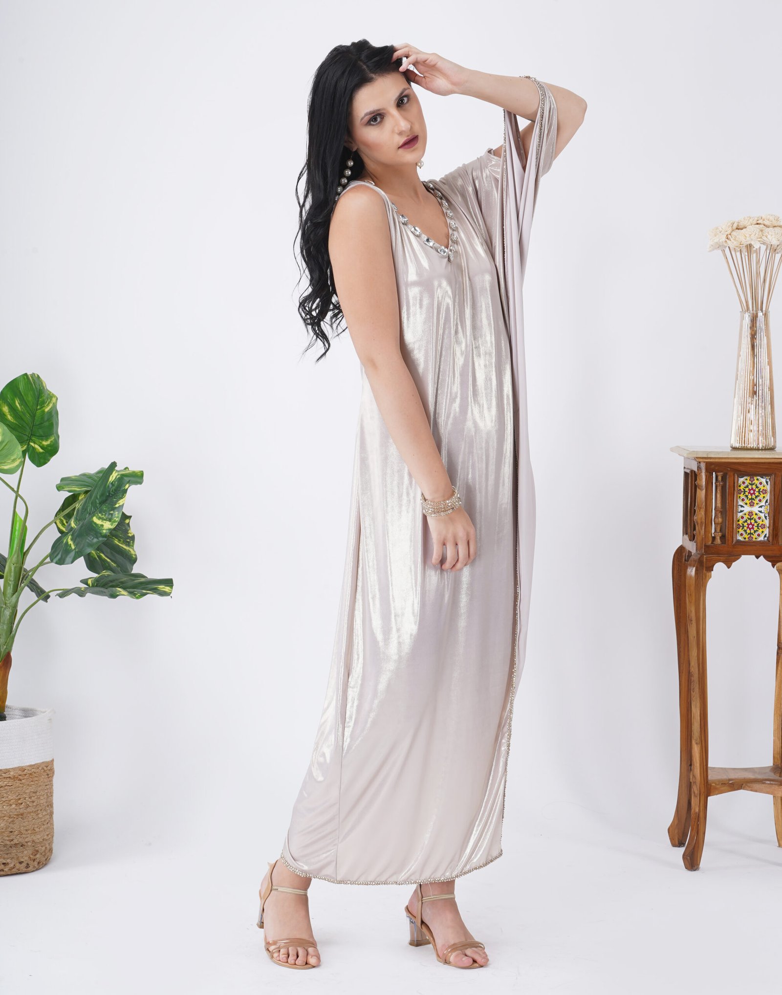 Super stylish Lycra Kaftan. Stone work on the neck. Perfect for parties and special occasions. A statement piece which is a must-have in your wardrobe.